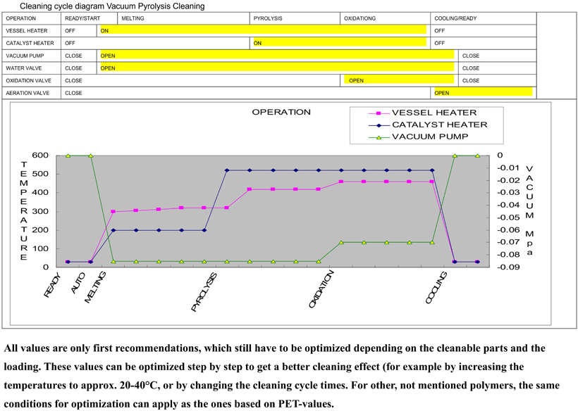 Vertical Vacuum Pyrolysis Cleaning Device: (VVPC-Series) Cleaning Objects:Filter of PET,PBT,PA,R-PET,Spin-pack of PSF As well as larger circular workpiece Cleaning Objects ![]() Principle: Vacuum Pyrolysis Cleaning device is designed specially for cleaning polymers from a variety of metal components. The parts to be cleaned are heated in a chamber where the polymer melts and drains into the bottom collector. Remaining polymer is vaporized and then water scrubbed in a secondary scrubber where condensates are collected and rush out with water. Since cleaning takes place under vacuum, combustion does not occur. The parts are protected from excessive or localized high temperatures. The whole process has no pollution. Cleaning stage: A.Melting stage During heating up(150℃),the PET materials adhering to the spin packs(or Filter) to be cleaned first all become liquid but do not decompose thermally. The melting plastic flows via a discharge trough into the cooler melt container,where it can cool down and then be removed for the further porcessing stage. B.Pyrolysis stage On reaching the decomposition temperature of the respective polymer,the heat output is regulated automatically in the process chamber in such a way that the best possible conversion is guaranteed in the catalytic converter. C.Oxidation stage The oxygen is added to the process chamber to oxidise any remaining residues of the organic products of decomposition.Any remaining inorganic residues on the cleaned components can easily be removed mechanically, D.Cooling stage The process chamber heating is switched off during the cooling stage。 Main Parts: Vacuum cleaning furnace by vacuum furnace, furnace cover mechanism, loading rack operation mechanism, stainless steel electric heating tube, waste collection device, gas heating, water spray cleaning device, water ring vacuum pump, gas-water separator and a microcomputer program system, water, gas path, etc. Photo Of Device: ![]() ![]() Specifications: