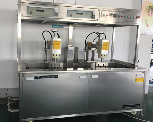 Device ![]() ![]() Take model B:NFU-1530D-R as example for some features. Cleaning ability: 4 spinnerets can be cleaned at the same time in this equipment. Cleaning method: It is cleaned by horn resonator,and the spinneret is rotating at all the cleaning time. Horn resonator is installed under the upper of cleaning tank,is used to cleaning up the top surface of works. Because the dimension between bottom of horn and top surface of work is so small(3-5mm),In order to load/unload the spinneret by fastly. We have designed a push-pull device for the horn.It can remove the horn from the scope of spinneret. Due to the working surface of horn resonator is small(230×25mm), so it is necessary to install a rotating device for spinneret。 The control cabinet is used to control the cleaning device operation, display equipment running status. Generator part : using high speed embedded processor; DDS digital frequency synthesis technology to keep frequency precise and stable and tracking in time. The communication function is to set the programmer and to adjust the frequency, power, time, working mode, etc. |