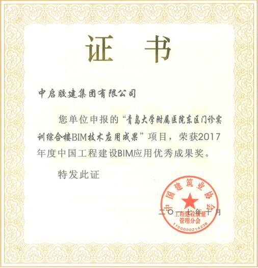 日前,我公司施工的青島大學附屬醫院東區門診實訓綜合樓工程的BIM技術應用成果榮獲中國建筑業協會2017年度中國工程建設BIM應用優秀成果獎。