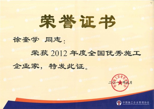 12月3日,由中國施工企業(yè)管理協(xié)會主辦的“2013年全國施工企業(yè)領(lǐng)軍人物峰會”在北京隆重舉行,公司總經(jīng)理徐奎學(xué)榮獲“2012年度全國優(yōu)秀施工企業(yè)家”稱號。