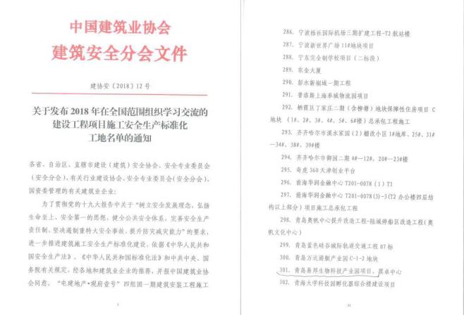 國家“建設工程項目施工安全生產標準化工地”是中國建筑業協會建筑安全分會在全國范圍內組織開展的大型評選活動,也是經住房和城鄉建設部批準的安全生產最高獎項。