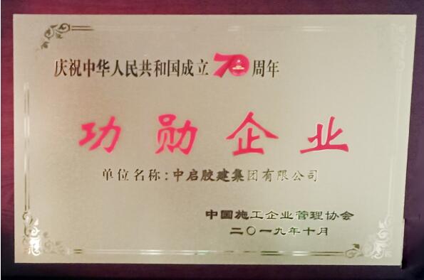 2019年11月16日下午,由中國施工企業管理協會主辦的工程建設行業慶祝中華人民共和國成立70周年宣傳展示總結大會在北京舉行。大會對中華人民共和國成立70周年以來工程建設行業取得卓越成績的百家功勛企業、百項經典工程和百名功勛工匠進行了宣傳表彰。中啟膠建集團榮獲“功勛企業”榮譽稱號,公司員工賈維敏、黃顯宏榮獲“功勛工匠”榮譽稱號。