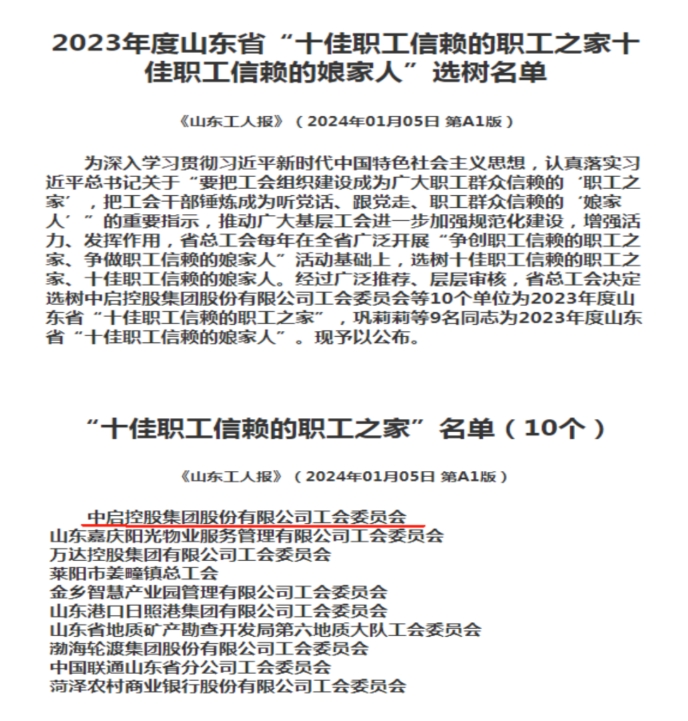 近日,山東省總工會在全省范圍內開展“爭創(chuàng)職工信賴的職工之家、爭做職工信賴的娘家人”選樹活動。經(jīng)過廣泛推薦、網(wǎng)絡投票、現(xiàn)場考察等層層審核,全省共選樹10個單位為2023年度山東省“十佳職工信賴的職工之家”,中啟控股集團股份有限公司工會委員會成功獲評此項榮譽。