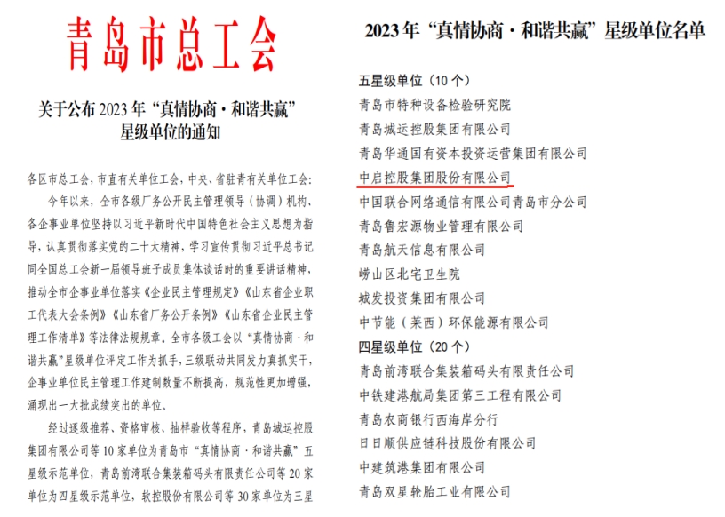 近日,青島市總工會發(fā)布《關(guān)于公布 2023 年“真情協(xié)商·和諧共贏”星級單位的通知》,中啟控股集團(tuán)股份有限公司喜獲2023 年“真情協(xié)商·和諧共贏”五星級示范單位。