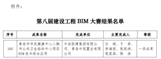 近日,中國建筑業(yè)協(xié)會(huì)發(fā)文公布了第八屆建設(shè)工程BIM大賽結(jié)果名單,公司承建的青島市市民健康中心二期市公共衛(wèi)生臨床中心項(xiàng)目榮獲“一類成果”佳績。