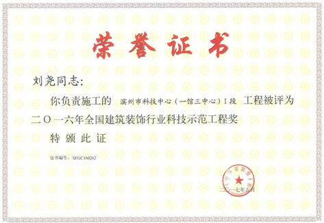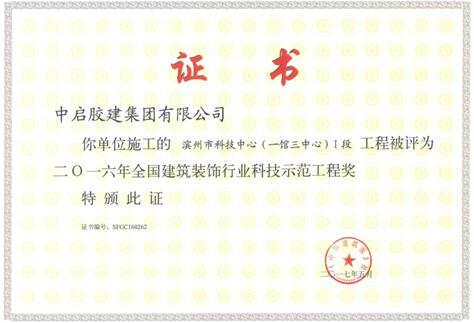 日前,2016年度全國科技創新成果、示范工程獎評選結果揭曉,我公司施工的濱州市科技中心(一館三中心)Ⅰ段榮獲2016年全國建筑裝飾行業科技示范工程獎,《廚衛間整體裝飾施工技術》、《利用玻纖壁布等措施控制墻體裂縫施工技術》、《一種幕墻玻璃安裝方法及所用的玻璃托架》三項新技術被評為2016年全國建筑裝飾行業科技創新成果獎。